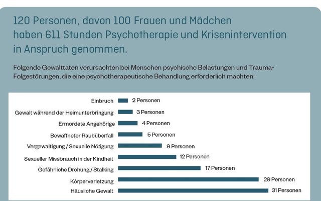 Im Jahr 2025 nahmen 120 Personen, davon 100 Frauen und Mädchen, 611 Stunden Psychotherapie und Krisenintervention in Anspruch. Trauma-Folgestörungen und psychische Belastungen bei Menschen, die dieses Angebot nützten, wurden durch folgende Gewalttaten ausgelöst: