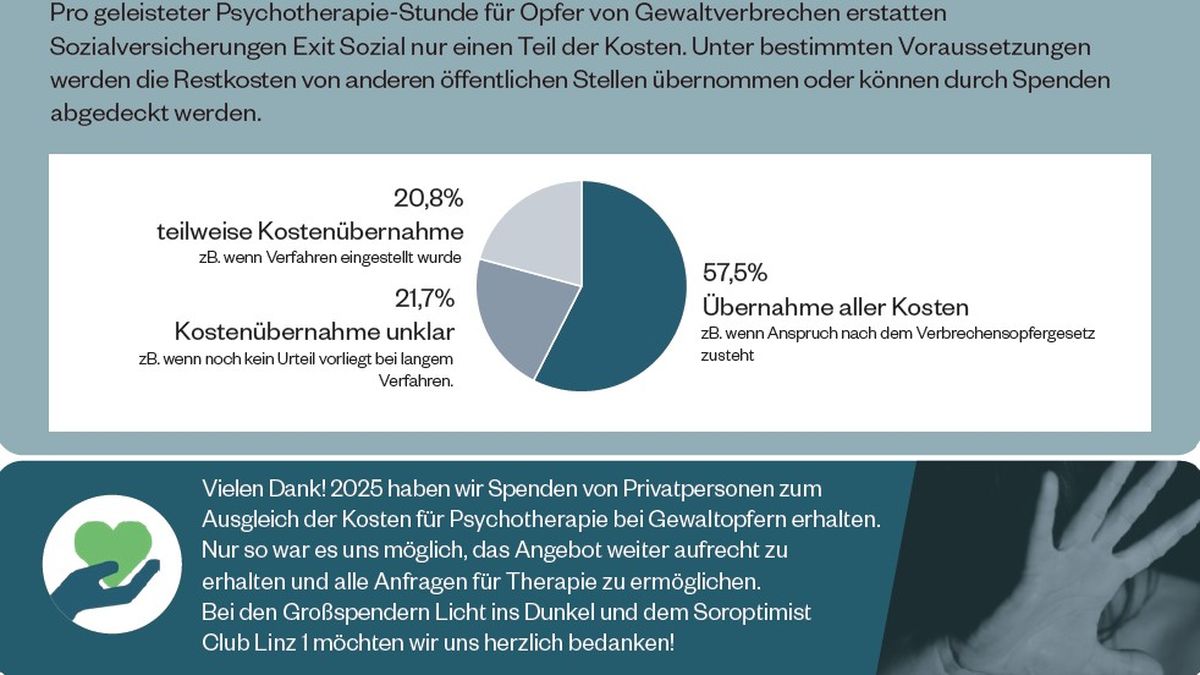 Pro geleisteter Psychotherapie-Stunde für Opfer von Gewaltverbrechen erstatten Sozialversicherungen nur einen Teil der Kosten an uns. Unter bestimmten Voraussetzungen werden die Restkosten von anderen öffentlichen Stellen übernommen oder können durch Spenden abgedeckt werden.