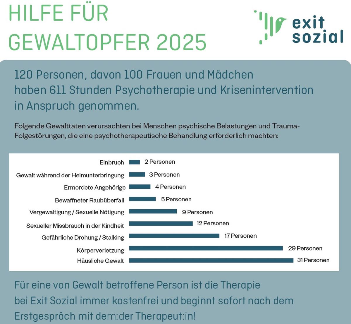 Im Jahr 2025 nahmen 120 Personen, davon 100 Frauen und Mädchen, 611 Stunden Psychotherapie und Krisenintervention in Anspruch. Trauma-Folgestörungen und psychische Belastungen bei Menschen, die dieses Angebot nützten, wurden durch folgende Gewalttaten ausgelöst: